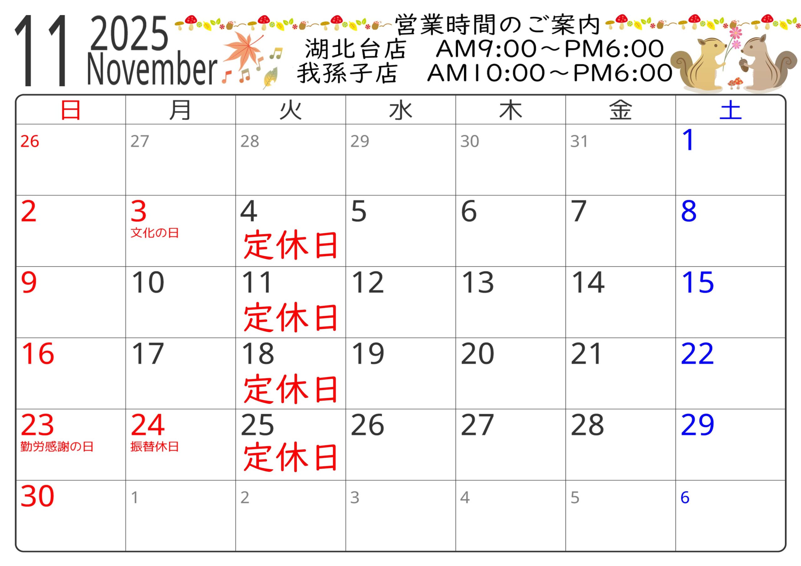 11月の定休日は湖北台店我孫子店共に4日・11日・18日・25日です。