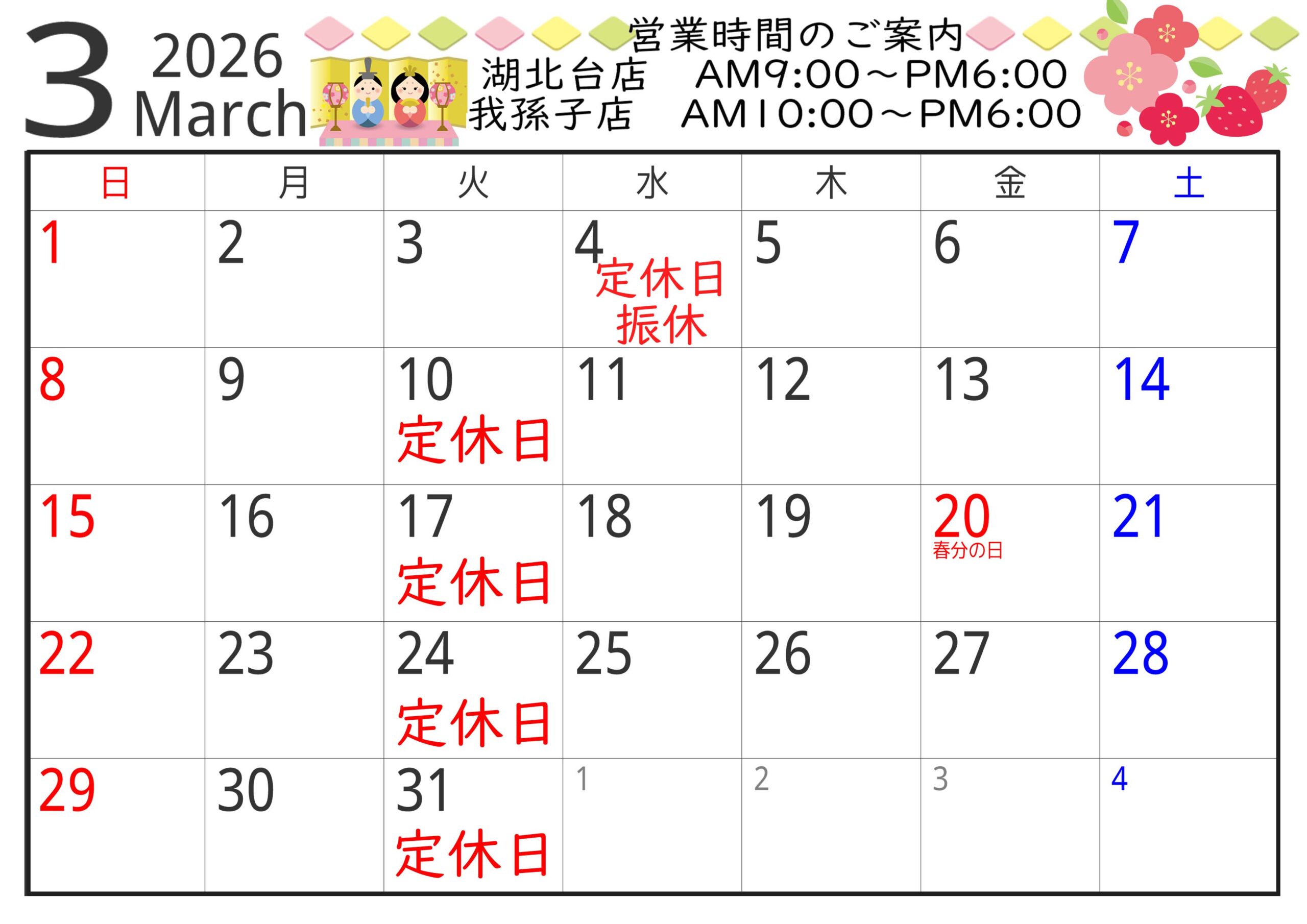2026年2月16日 お知らせ 3月のお休みのお知らせ 3月のお休みは湖北台店我孫子店共に4日・10日・17日・24日・31日です ※3日(火)はひなまつりのため営業致します。振休は4日(水)となります。 前の記事