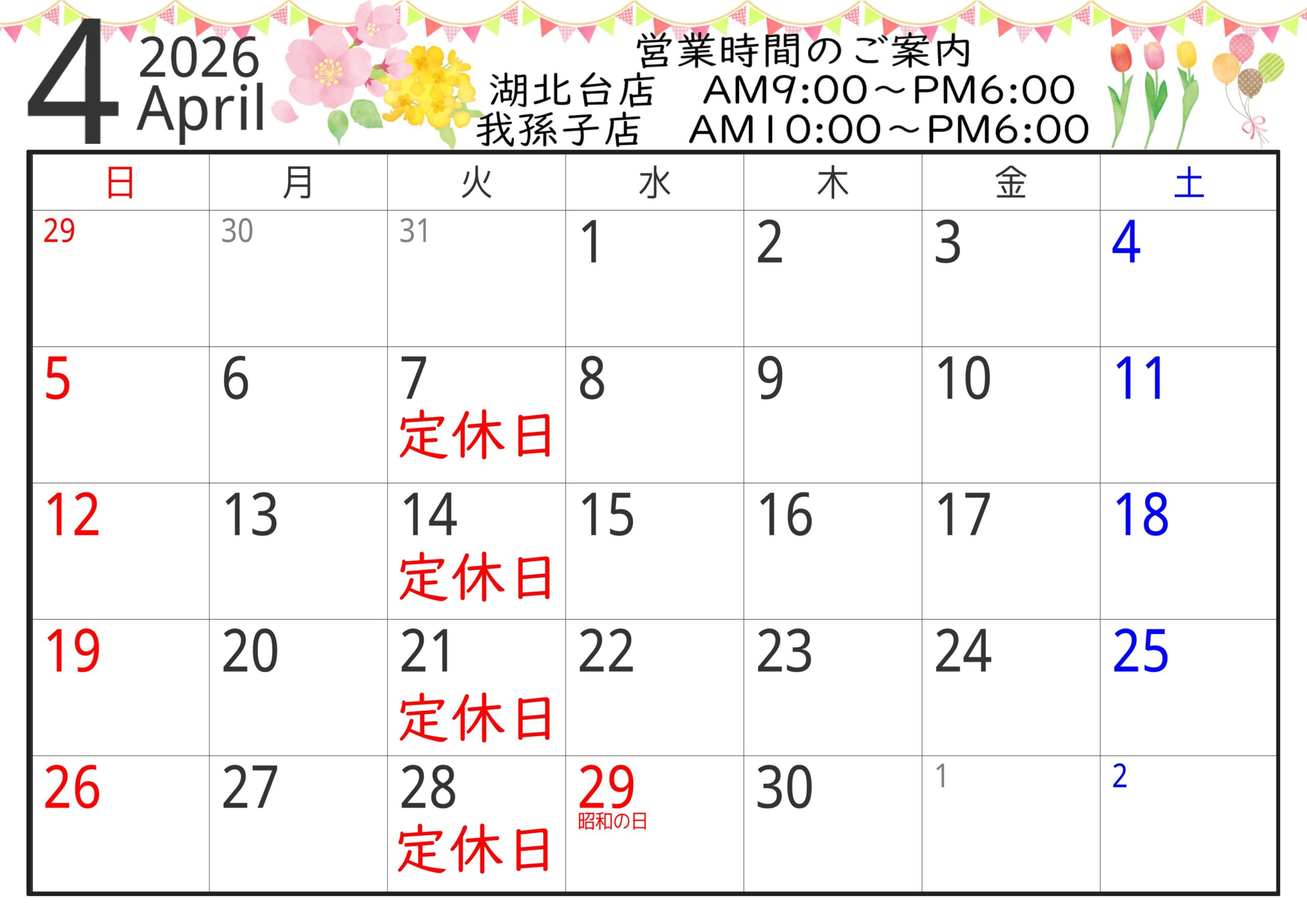 4月の定休日は湖北台店我孫子店共に7日・14日・21日・28日です。