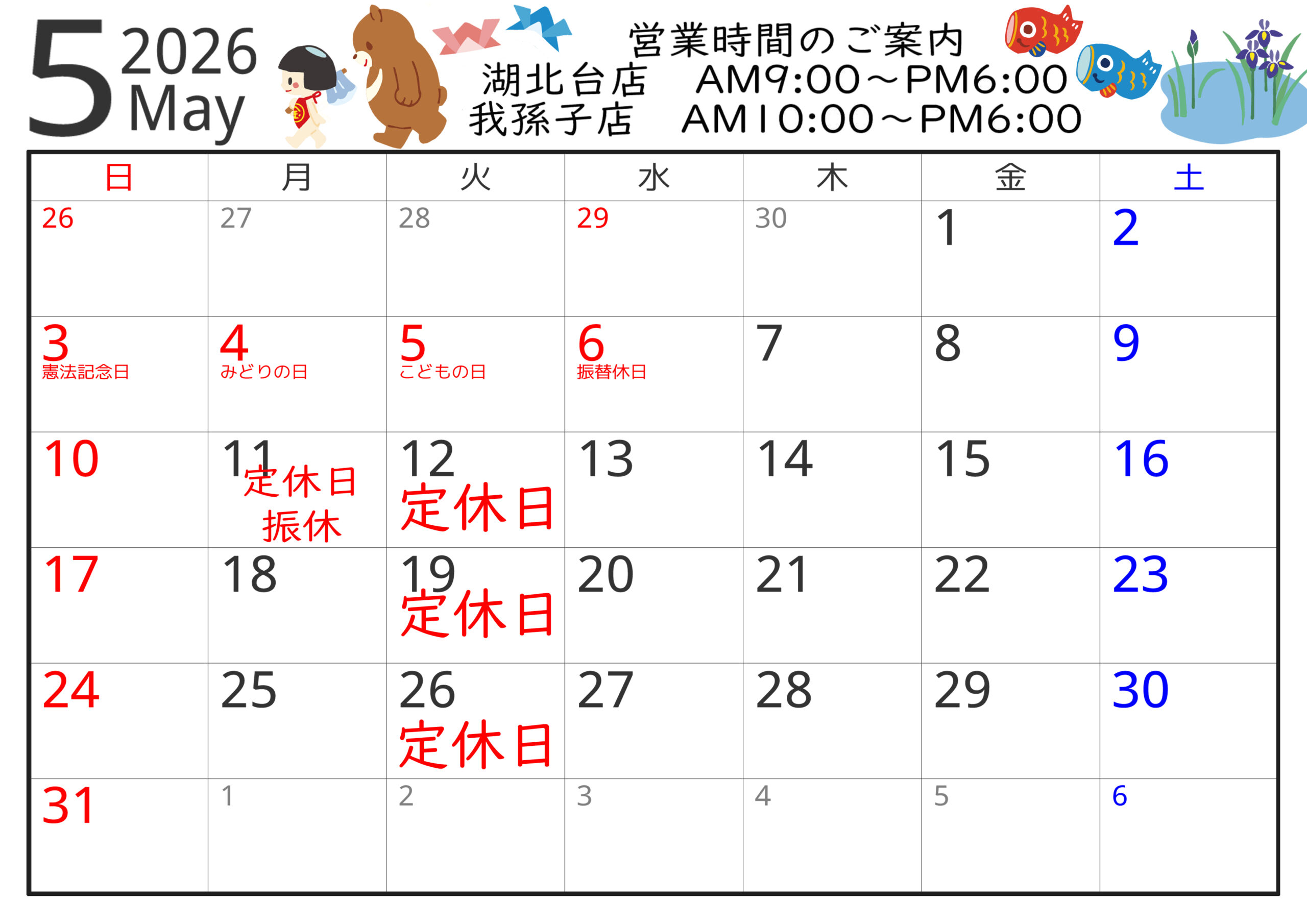 2026年4月19日 お知らせ 5月のお休みのお知らせ 5月のお休みは湖北台店・我孫子店共に11日・12日・19日・26日になります ※5月5日はこどもの日のため営業いたします。振休は翌週の11日になります。 前の記事 次の記事
